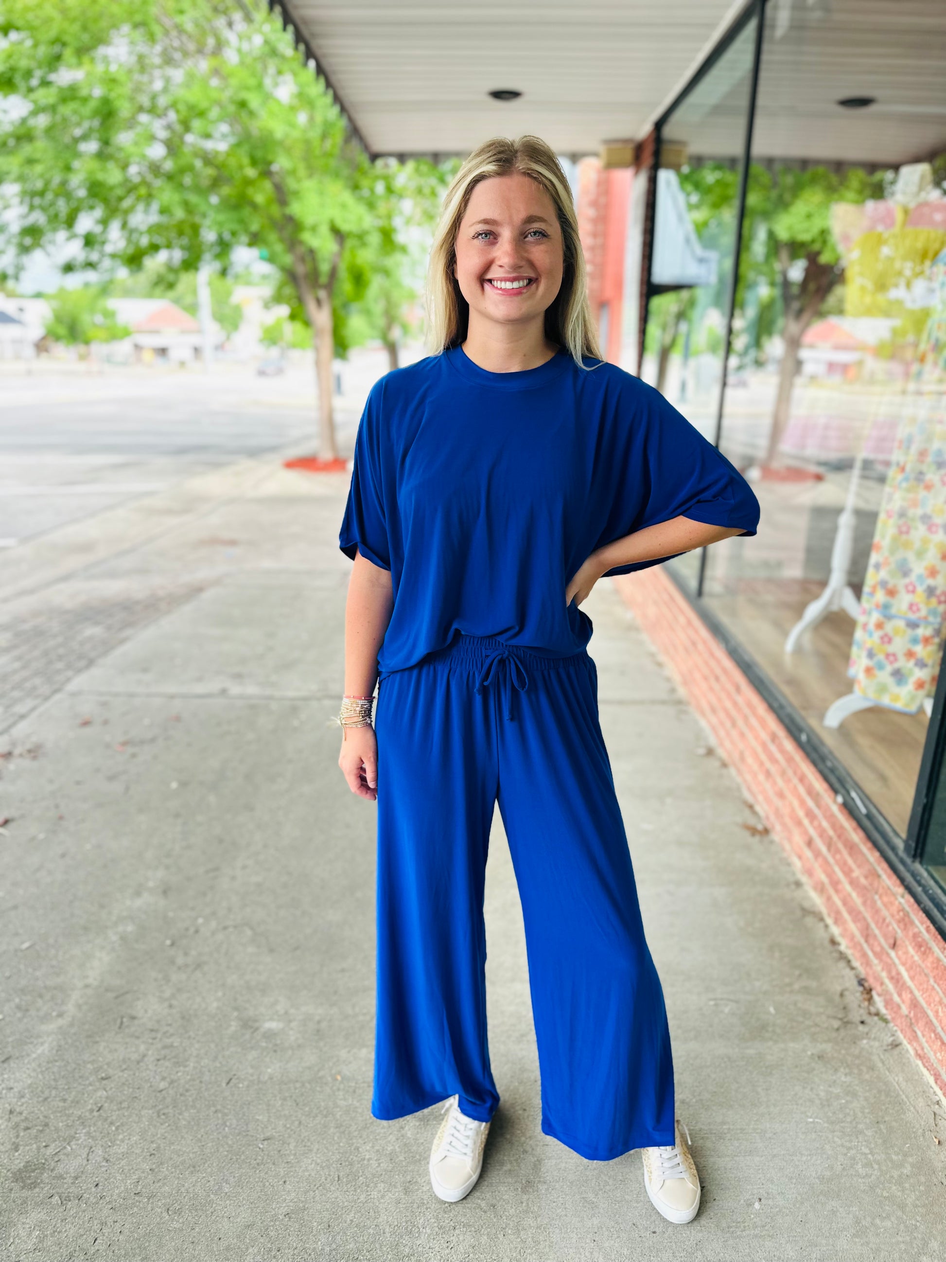 This flowy top and pant set in royal blue offers both comfort and style. Its loose fit allows for easy movement, while the vibrant color adds a touch of fun. Perfect for a day out, this set is a must-have for any fashion-forward individual.