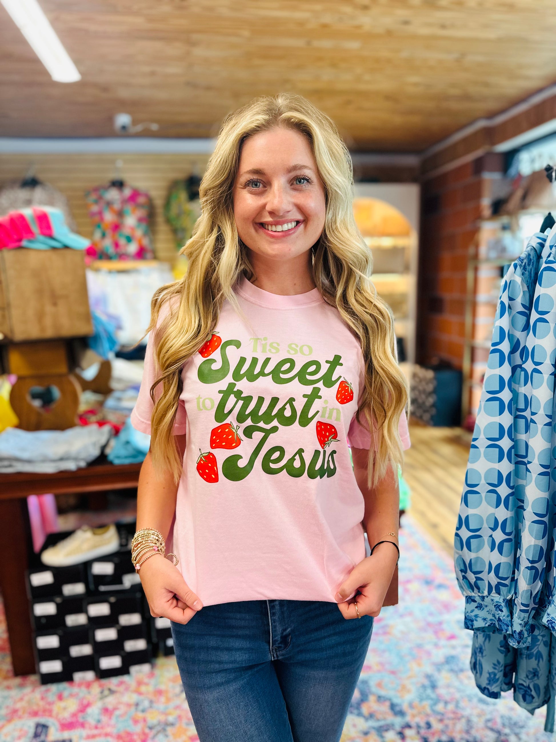 Sweetly trust in Jesus with this playful strawberry tshirt. With its quirky design and idyllic message, Tis So Sweet will not only brighten up your wardrobe, but also serve as a reminder to have faith in the sweetest ways.