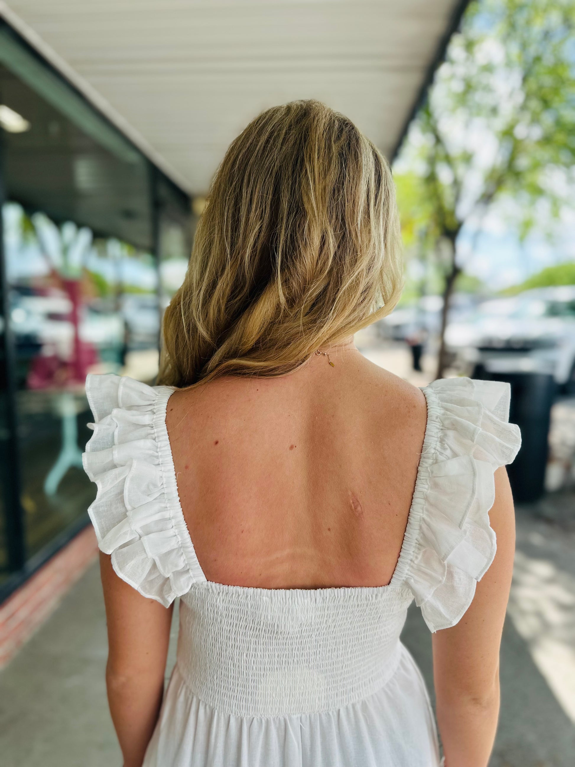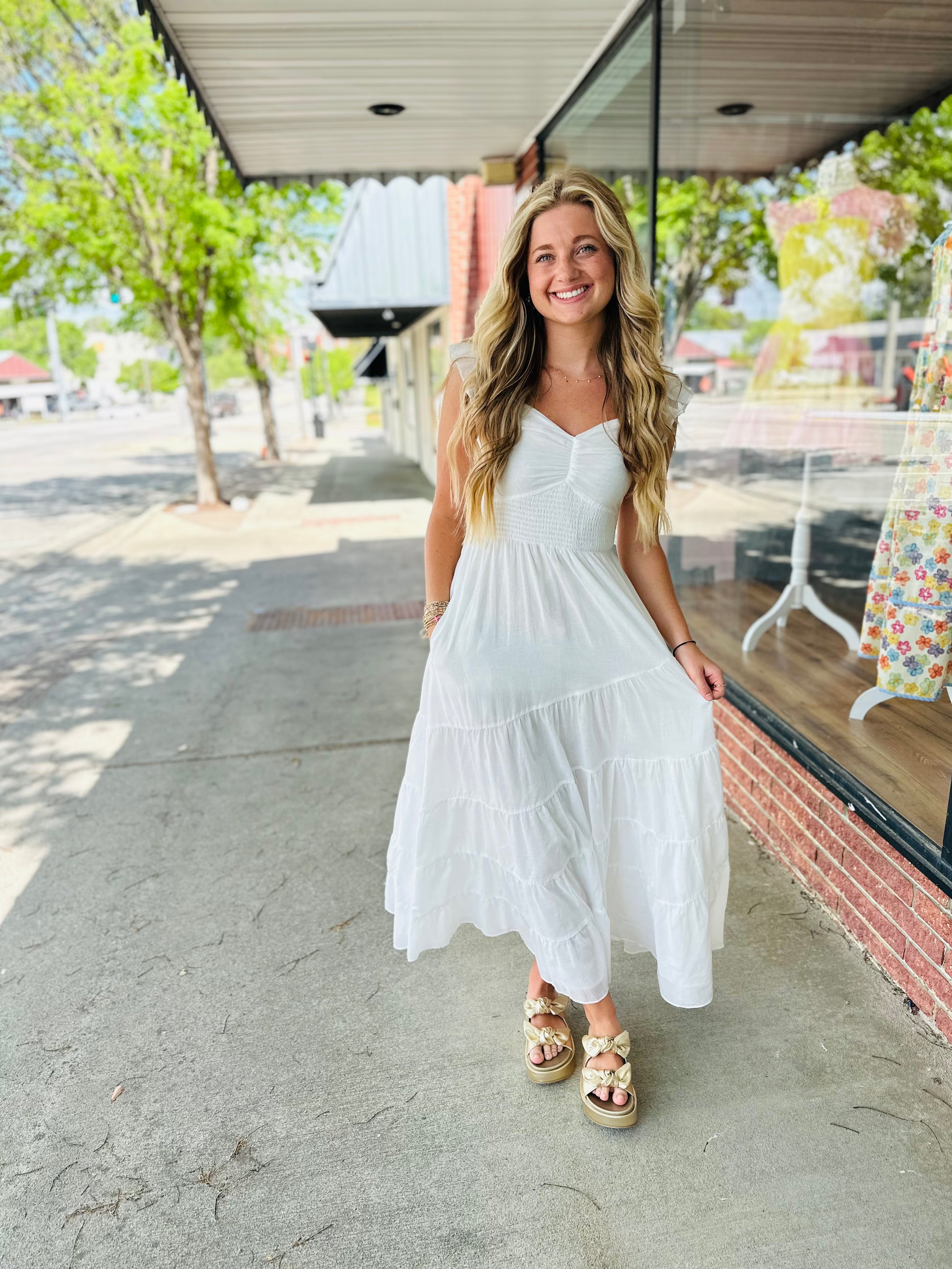 This elegant white smocked maxi dress features a stunning, feminine silhouette with delicate ruffles. The long length creates a flowy look. Perfect dress for the beach or wedding.